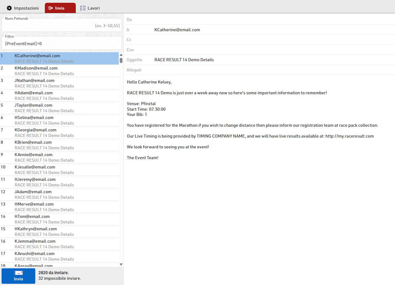 È possibile scegliere di inviare l’email a Pettorali specifici oppure modificare il filtro prima dell’invio.