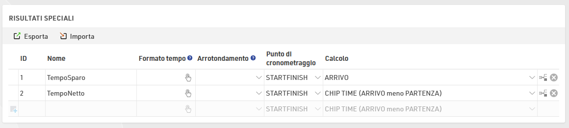 Ogni gara può essere impostata per mostrare in classifica, di default, il tempo dallo sparo o il tempo del chip: impostando questo parametro, in base alla gara si avrà un settaggio facilitato nella sezione Output dei risultati finali.