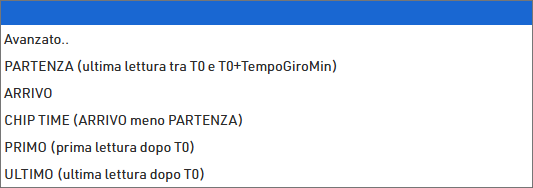Minimo tempo giro: definisce il tempo minimo da utilizzare per i giri. Ciò vale anche per il calcolo PARTENZA, per definire il tempo massimo di inizio (ultima lettura tra T0 e T0+TempoGiroMin) e quando Numero di giri è 1, definisce il tempo minimo per il calcolo ARRIVO.