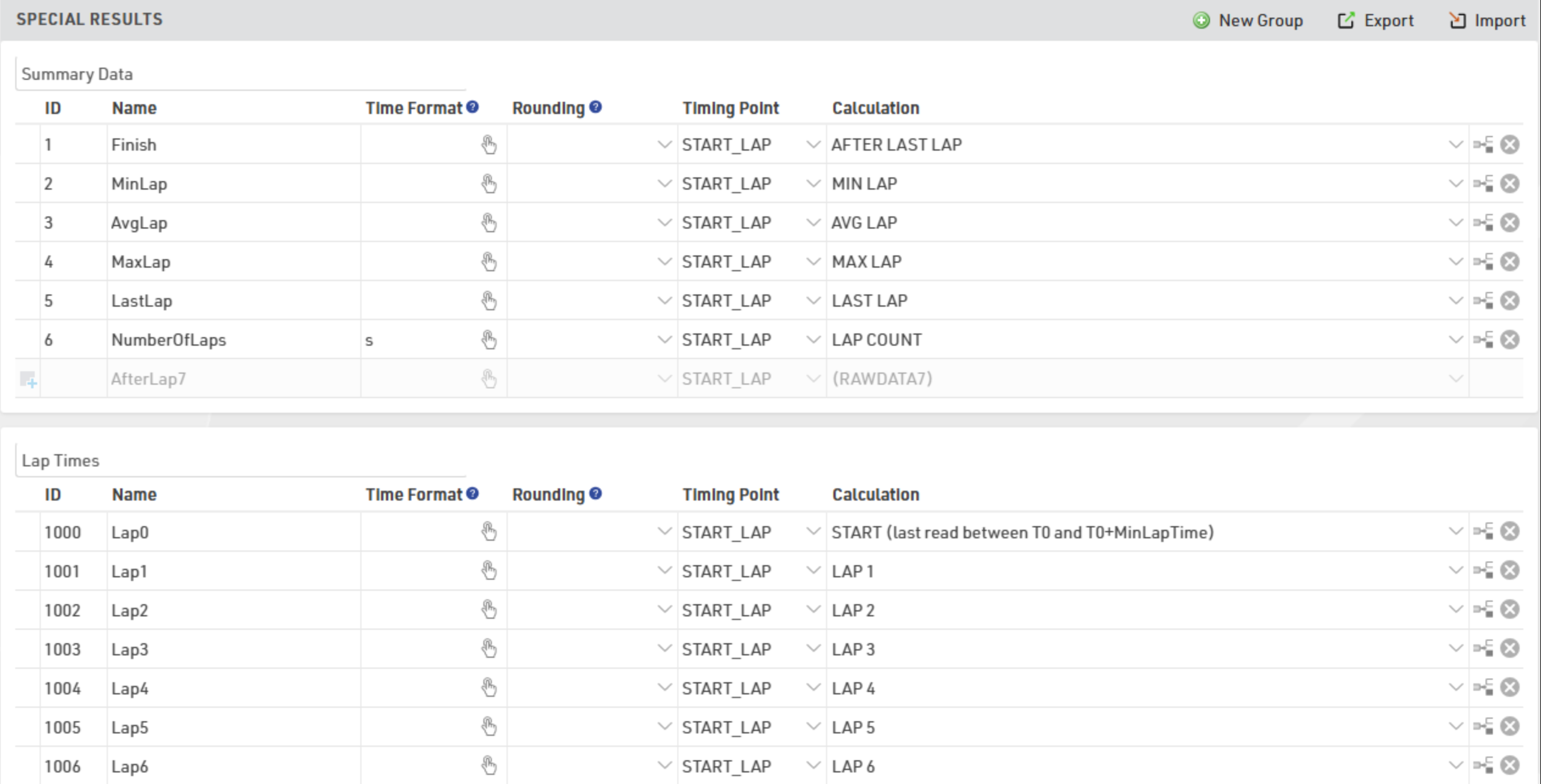 Risultati speciali: i risultati sono campi associati a un tempo, che possono essere estratti/calcolati da dati grezzi o calcolati da intermedi/altri dati. I risultati potrebbero essere richiesti per determinati tipi di eventi come le gare a giri variabile.