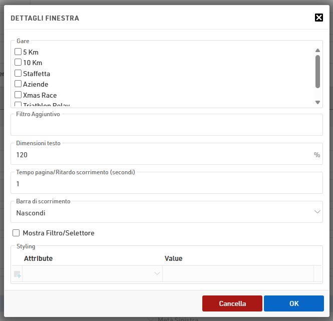 Le gare possono essere filtrate nella finestra delle impostazioni avanzate in modo che lo stesso elenco di output possa essere utilizzato per creare finestre diverse per gare specifiche.