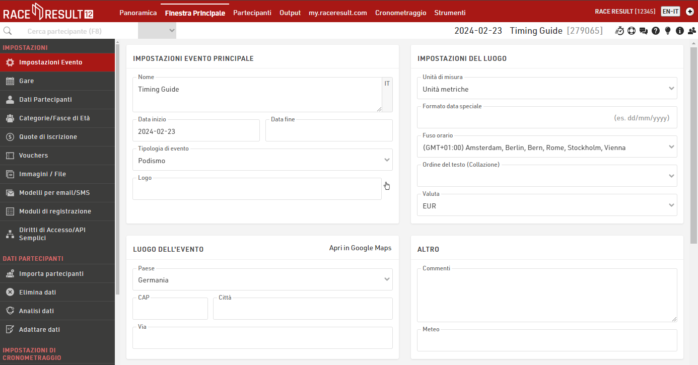 Le impostazioni di base dell'evento si trovano nel primo menu della finestra principale. Qui è ancora possibile modificare il nome dell'evento, la data e altre informazioni di base.