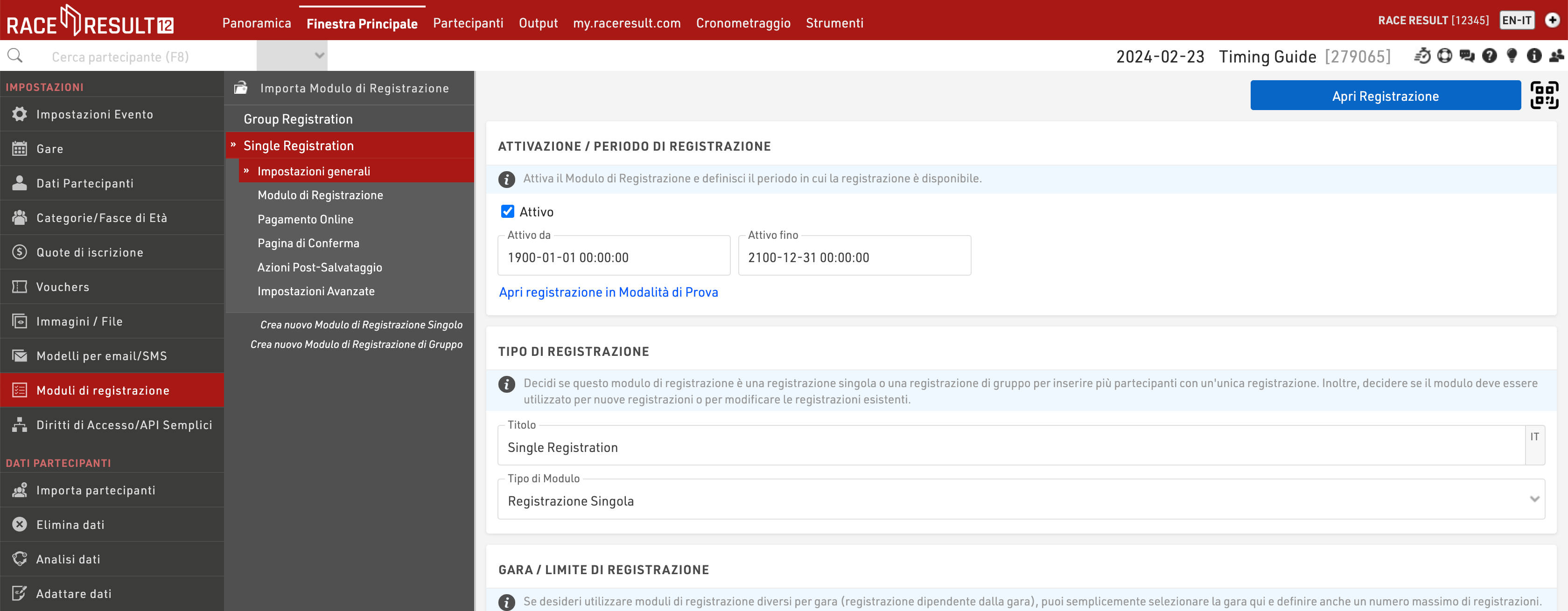 La registrazione tramite RACE RESULT 12 viene gestita tramite moduli di registrazione. I moduli di registrazione possono essere utilizzati per acquisire i dati dei partecipanti, ricevere il pagamento e inviare un'e-mail di conferma automatizzata. Questi moduli di registrazione possono essere utilizzati sia per la registrazione online che per la registrazione in loco, anche quando si lavora offline.