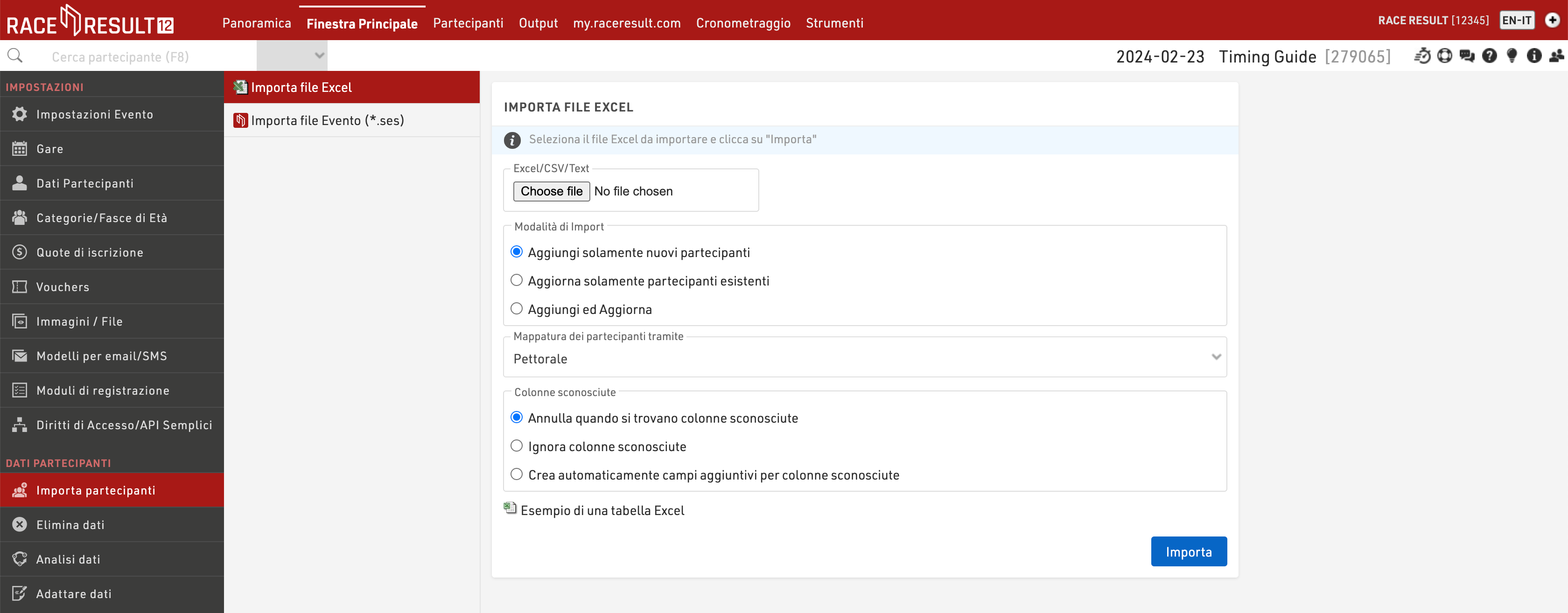 Se non si utilizza la registrazione tramite RACE RESULT 12, è anche possibile importare i partecipanti da un file Excel o CSV.