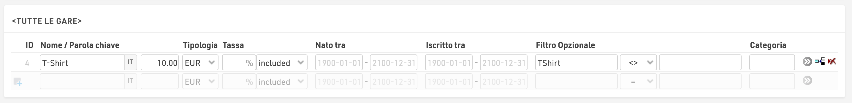 Per aggiungere ulteriori quote di iscrizione è sufficiente definire il Nome e il Valore, le quote di iscrizione verranno applicate automaticamente a tutti i partecipanti oppure è possibile definire alcuni filtri aggiuntivi per le singole quote di iscrizione.