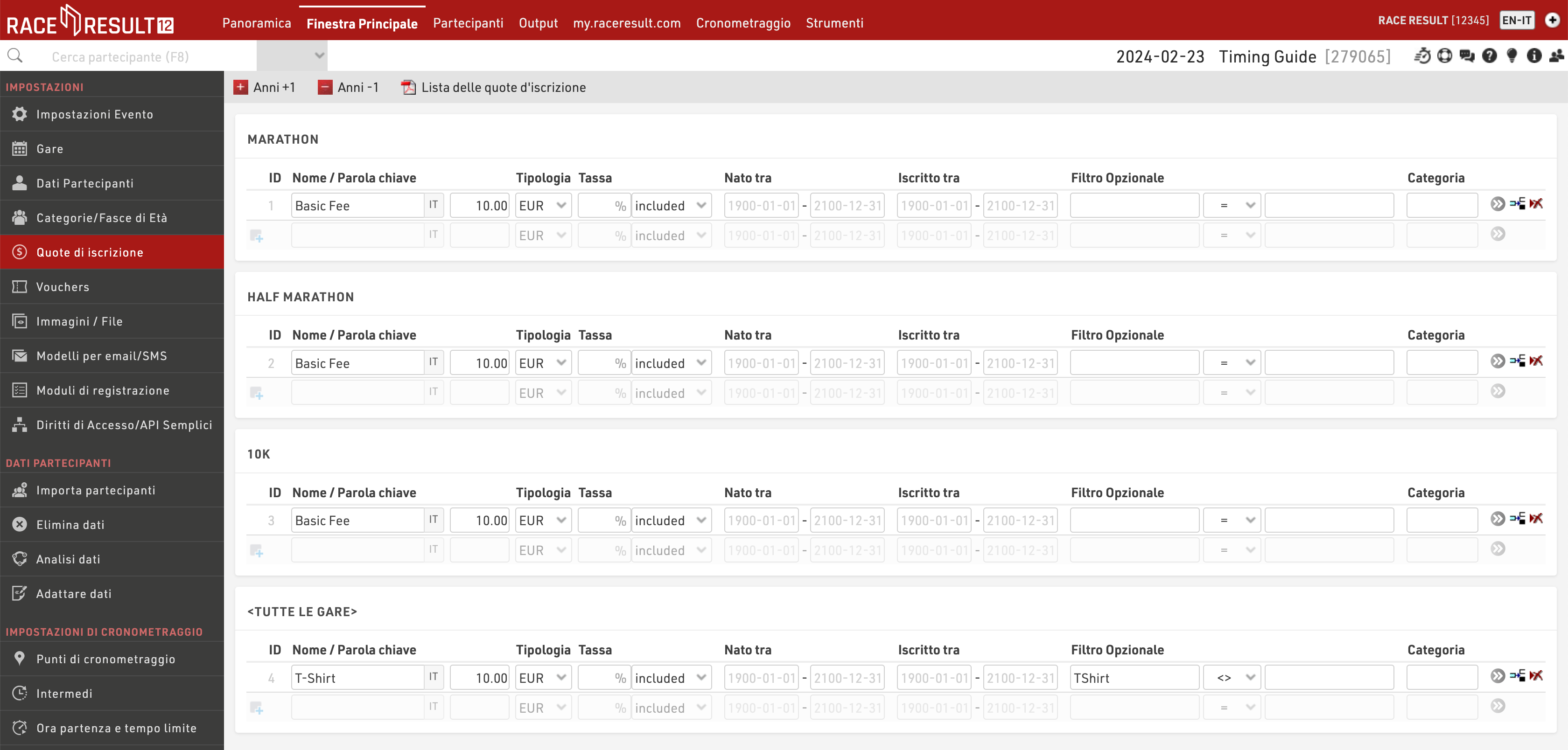 Le quote di iscrizione possono essere definite individualmente per ciascuna Gara o applicate a tutte le Gare.