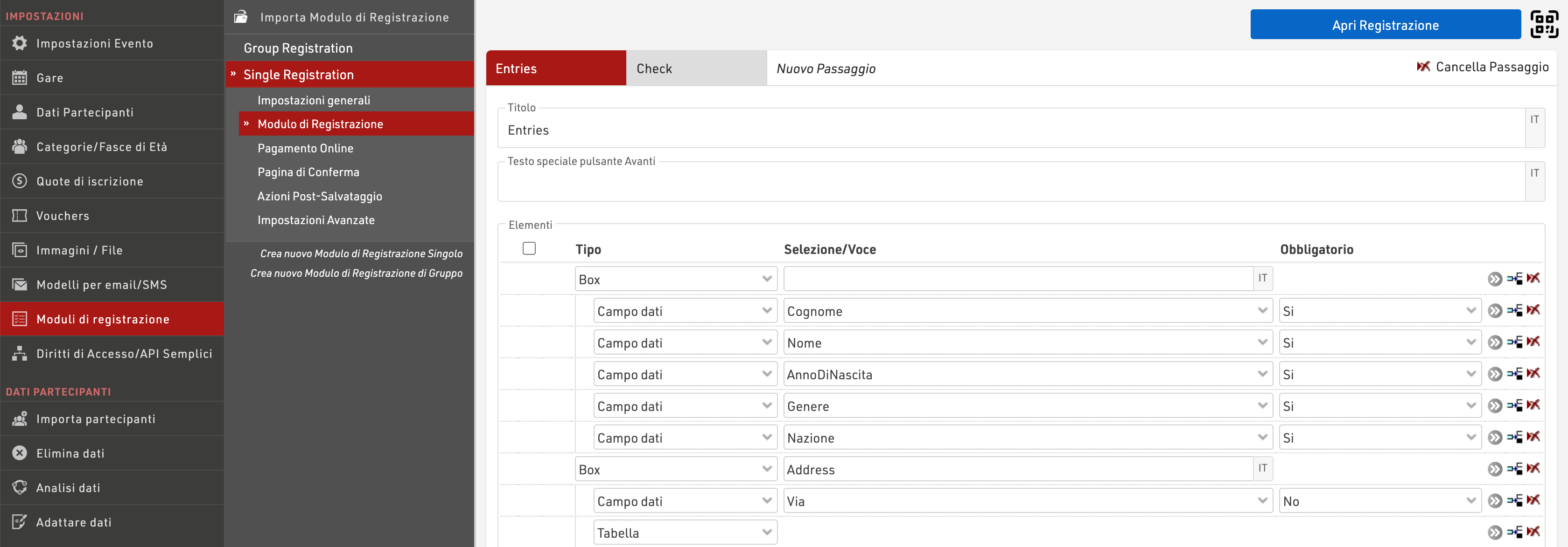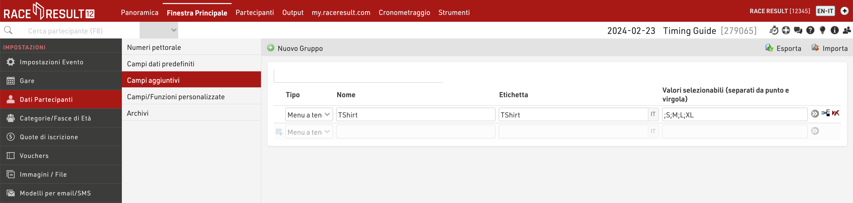 È possibile creare tutti i campi aggiuntivi necessari per memorizzare i dati dei partecipanti; questi campi possono essere utilizzati ad esempio per registrare la taglia di una maglietta, informazioni sui contatti di emergenza o informazioni sui membri della squadra di staffetta.