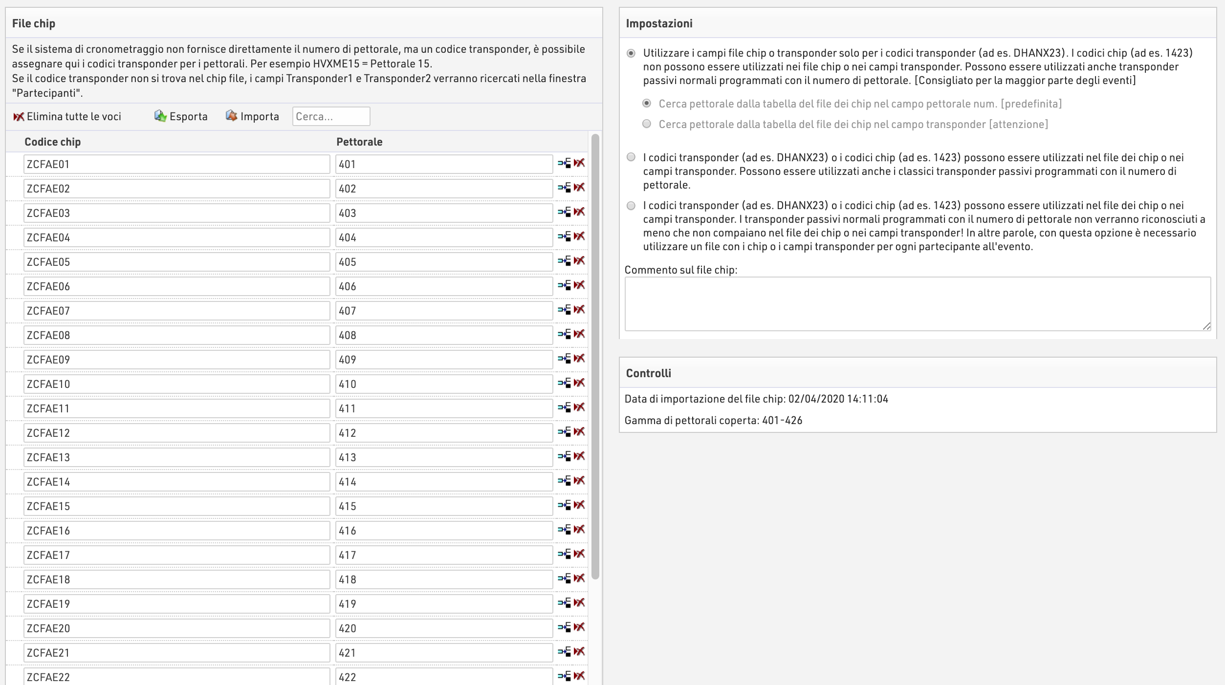 Il file chip è il modo più semplice per assegnare i transponder quando si ha un transponder noto e preassegnato per ogni pettorale.