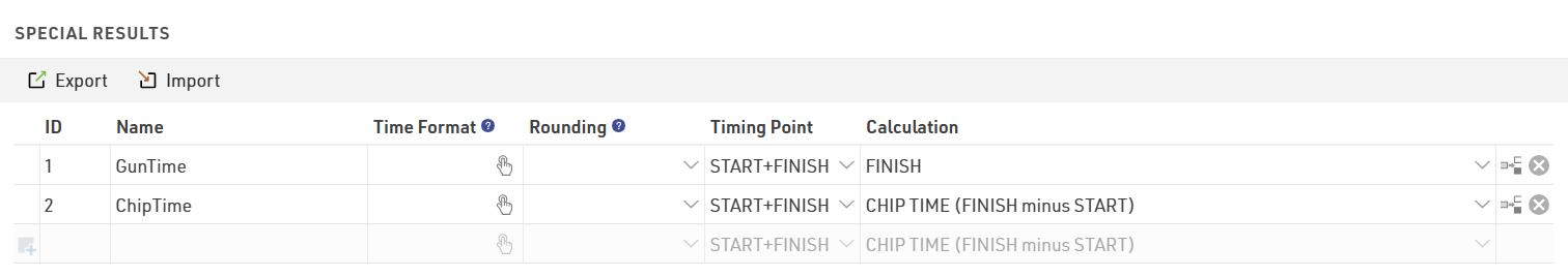 Il tempo del chip o tempo netto (definito come arrivo meno partenza) può essere calcolato usando la Formula risultato ma è più semplice usare questa regola. La regola TEMPO CHIP esegue internamente la regola ARRIVO e poi sottrae il risultato dalla regola PARTENZA. Se non esiste una lettura valida di partenza, verrà sottratto il tempo T0.