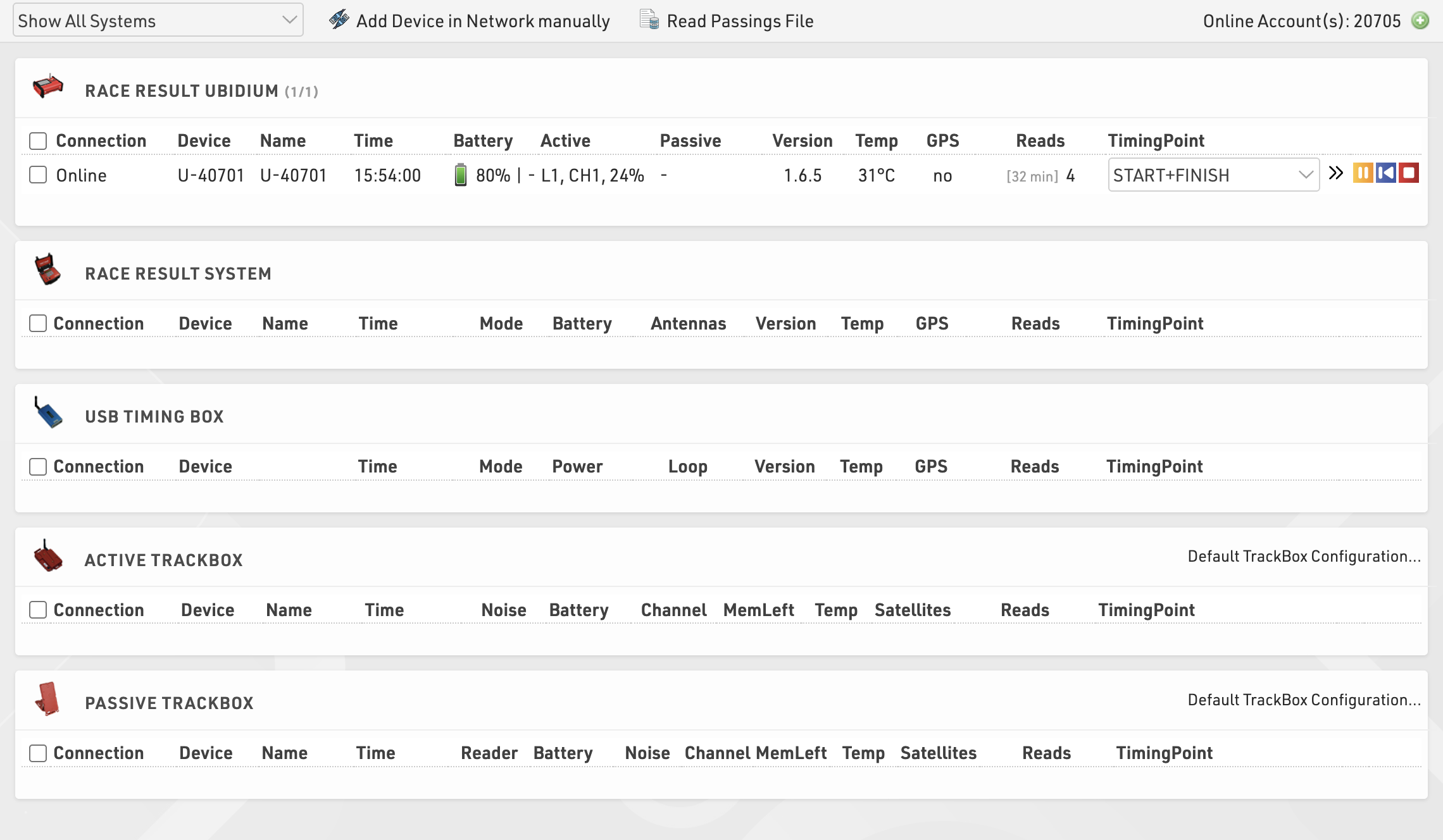 Any available devices (via your local network or online) are listed automatically, grouped by device type, a window is always shown for both RACE RESULT Ubidium and RACE RESULT System, additional device types will be shown if available either locally or online.