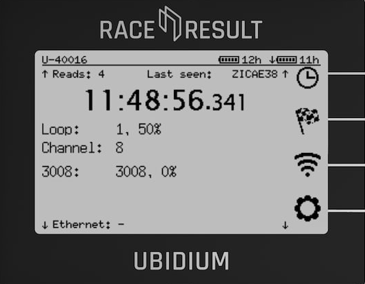 LED Backlight Green - System has GPS fix, active loop or ground antenna connected and either a Cloud connection or connection to a local RACE RESULT 12 instance. Orange - Loading and confirmation of new passings file creation |